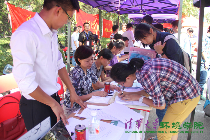 在综体网球场迎新点,本科教学办公室韩国芬老师亲切接待了前来报到的新生,杜卓老师为困难新生提供绿色通道及爱心补助。本科生学生工作组组长陈熹、团委书记丛逸、环四年级辅导员谢昌益协助新生办理报到手续。21名新生党员及领军计划志愿者也在不断奔走,认真工作,为迎新贡献自己的力量。环境学院的吉祥物“小绿”一直活跃在迎新现场,与新生及家长合影,有效地调节了迎新的紧张氛围。下午,校长陈吉宁来到了紫荆区迎新点,与迎新工作人员和正在办理手续的新生进行了亲切交流,详细了解了迎新工作情况和新生的报到情况。
