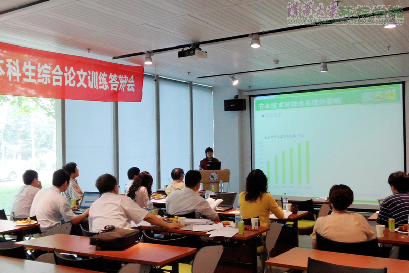 清华环境学院6月18日电 (通讯员 韩国芬,张颖) 6 月13 日上午,环境学院2012 届本科毕业生综合论文训练答辩会在中意环境节能楼举行。环境学院2012 届毕业生共96 名同学(其中包括4名留学生,1名环7学生和1名生物系学生)分为4 组参加毕业论文的答辩,4个答辩小组分别由黄霞、李广贺、汪诚文和段雷4 位老师担任答辩会主席,环境学院副院长左剑恶等40多位老师担任评委,并全程参加了答辩会。