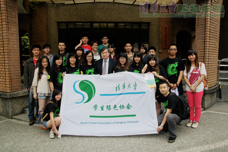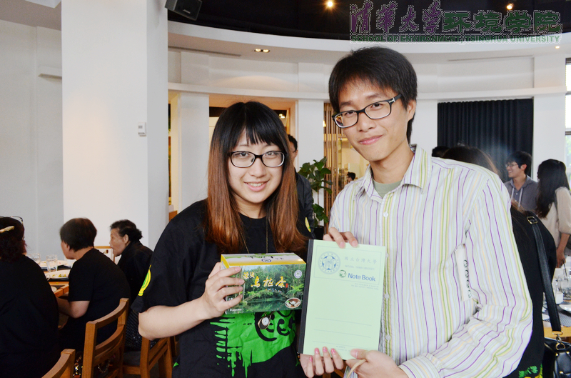 图为台湾大学环工所蒋本基教授向清华大学学生绿色协会授予“环工之友”锦旗.