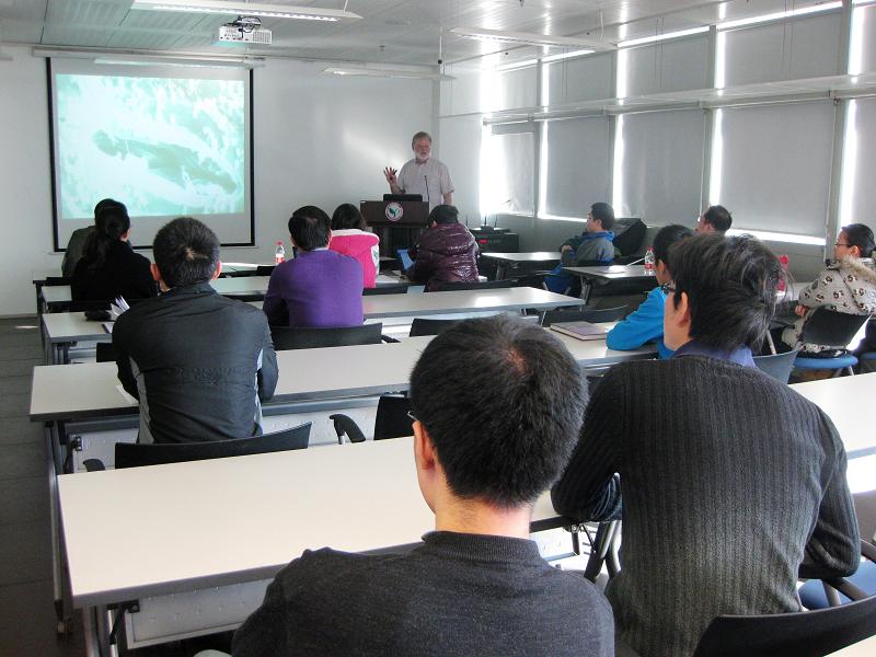 林多教授分享了他在细胞迁移(cell immigrant)、群感效应(quorum sensing)方面的研究成果。他指出,迁移的细胞在干叶(dry leaves)原有集群(existing aggregates)中可以更好的生存。群感效应(quorum sensing)是微生物-植物生态研究的热点,有些细菌自身能产生一些可扩散的信号分子,随着细菌群体密度的增大,这些信号分子在环境中积累的浓度也增加。细菌通过感受环境中这些信号分子的浓度,能判断其群体的大小,当这些信号分子在环境中积累到一定浓度,其在细菌细胞中的积累也达到临界浓度(高浓度),这时细菌的某些特定基因才得以表达。这种现象称为细菌的群感效应。林多教授以高丝氨酸内酯(AHLs)作为信号分子,在细菌入侵植物的生态研究中取得了多项成果。