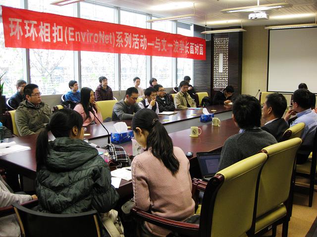 11月22日,由环境学院主办的“环环相扣(EnviroNet)系列活动——与文一波学长面对面”在环境节能楼205举行。本次活动邀请到我院杰出的企业家校友、中国最大的民营环保企业桑德集团创始人、桑德环境资源股份有限公司董事长文一波学长,与大家面对面分享自主创业的酸甜苦辣,指点职业发展迷津,畅谈环保产业热点。环境学院院长余刚、党委书记杜鹏飞、副院长左剑恶、党委副书记刘建国以及研工组组长刘艳臣出席,环境学院30余名学生参加了活动。本次活动由刘建国主持。
