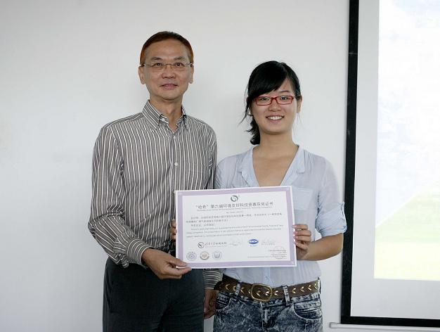图为环境学院院长余刚为实物类一等奖得主李梦凯颁奖。