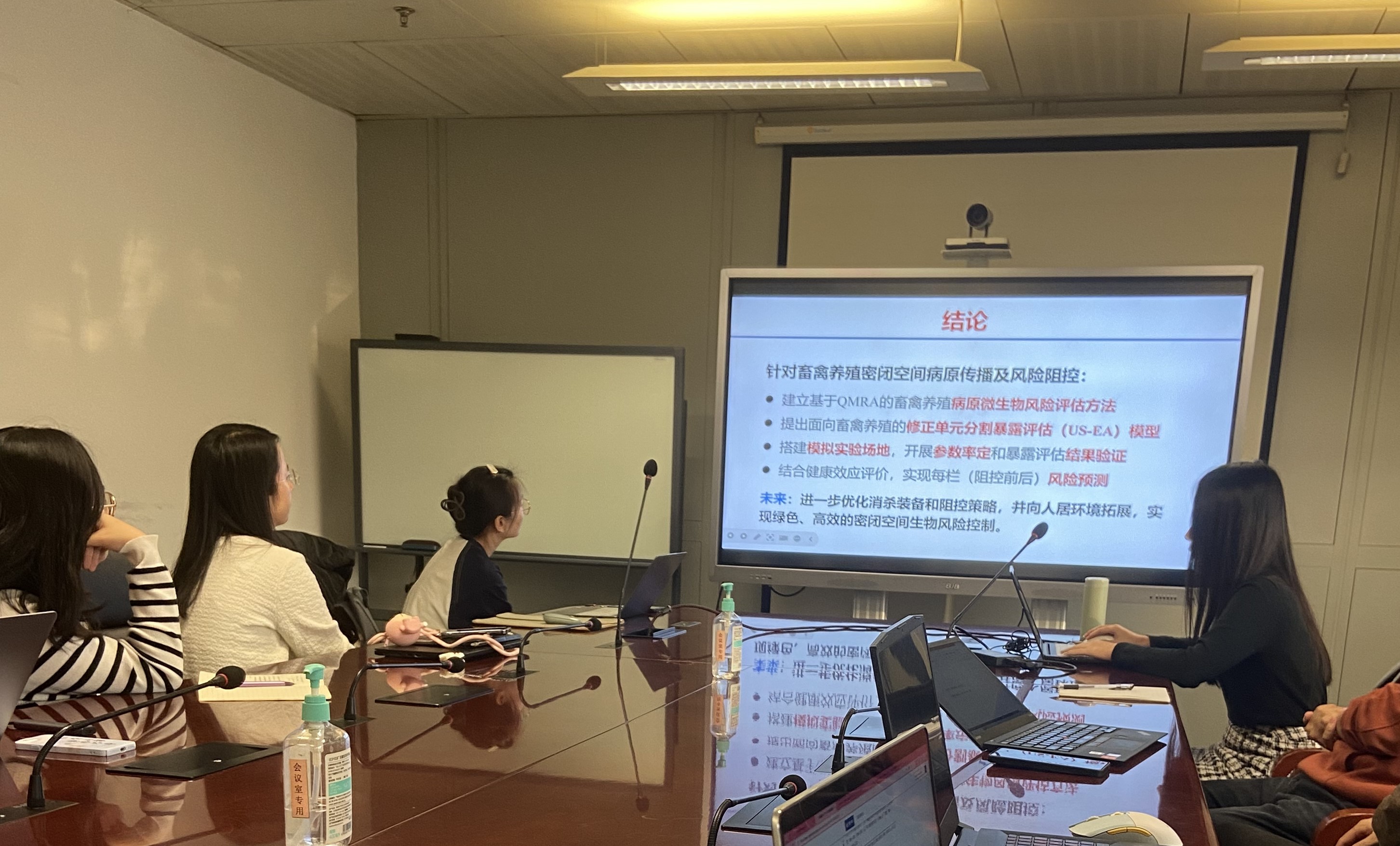 参与课题三研究工作的中国科学院生态环境研究中心2022级硕士生马世娇从畜禽养殖生物安全和生物风险原位控制技术的视角出发,分享了基于QMRA(微生物定量风险评估)的畜禽养殖病原微生物生物风险评估方法构建过程以及畜禽养殖的修正单元分割暴露评估模型(US-EA)研发进展,详细介绍了模拟实验场地搭建、模型参数率定分析、暴露评估结果验证等技术细节与工作内容,提出未来将继续优化消杀装备和阻控策略,将研究进一步向人居环境拓展。
