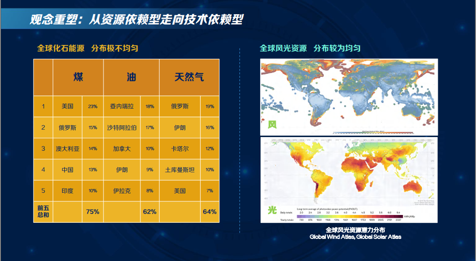 贺克斌教授表示,在全球推进碳中和的进程中,世界经济发展观念会发生根本性变革,将从资源依赖型向技术依赖型转变。目前,煤炭储量最多的前五个国家占了全球煤炭75%的储藏量;石油储量,前五个国家占了62%;天然气储量,前五个国家占了64%,传统化石能源资源分布明显不均匀。而全球风光资源分布则相对更均匀,未来风电光电等新能源比例逐渐上升后,谁的新能源技术领先,谁有效利用的能源就更多,经济发展走向技术依赖型。但2050年实现净零排放的关键技术中,50%目前尚未成熟,因此迫切需要科技创新,这也成为各国竞争的新焦点。